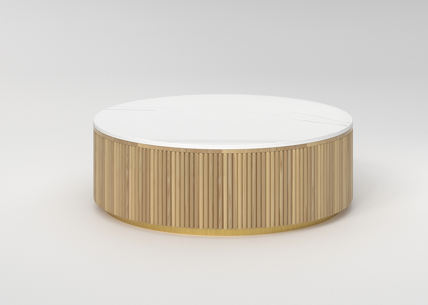 | Model: | 104852412 | Type: | Coffee table | Size: | DIA1000*350MM | Material: | Sintered stone+MDF with ash veneer natural color+stainless steel brushed plating golden color | Color: | White | Base/leg Color: | Nature+Gold |