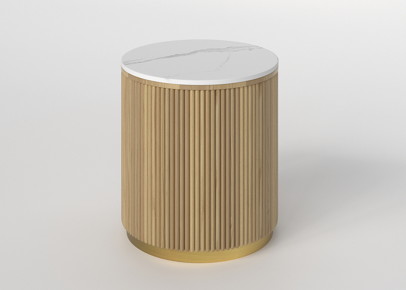 | Model: | 105852415 | Type: | End table | Size: | DIA500*560MM | Material: | Sintered stone+MDF with ash veneer natural color+stainless steel brushed plating golden color | Color: | White | Base/leg Color: | Nature+Gold |