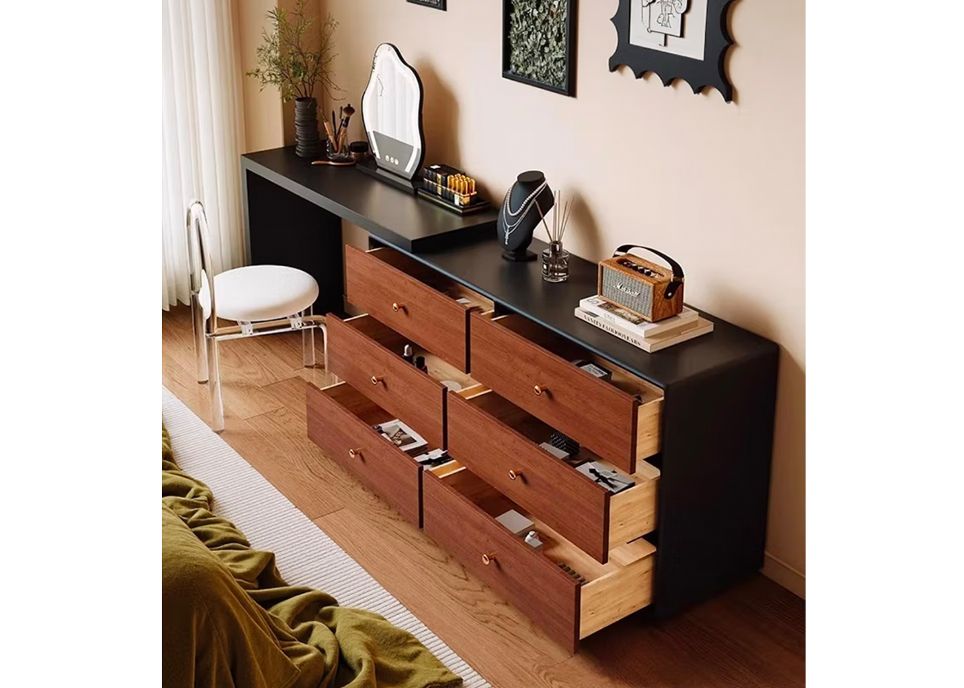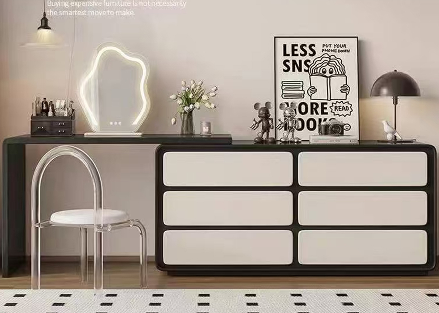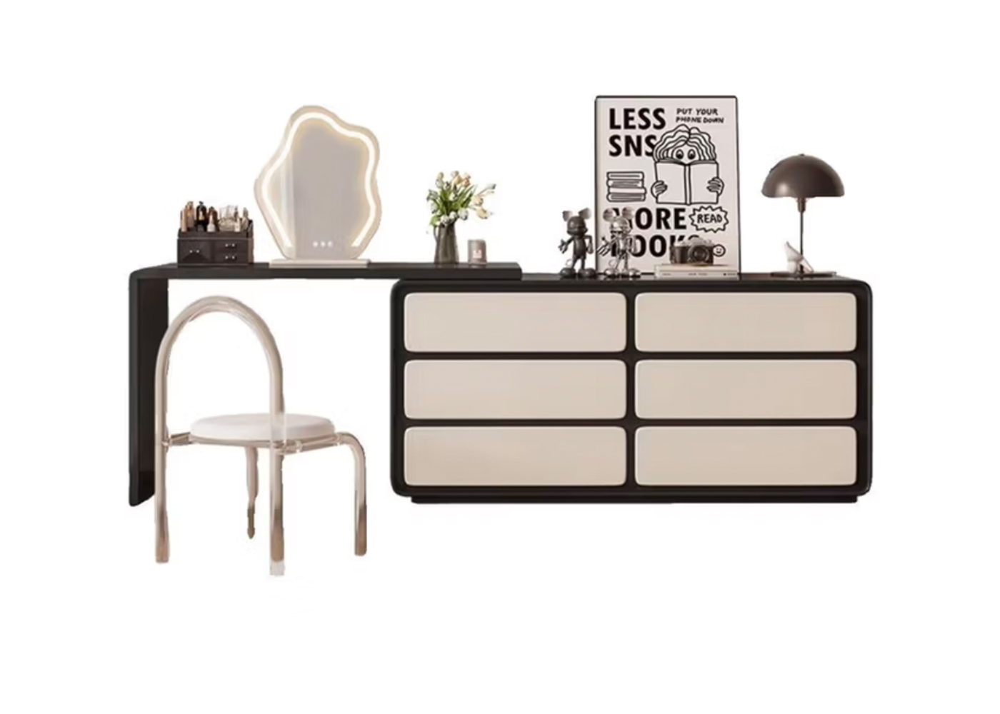 | Model: | 118141801 | Type: | Dressing table | Size: | 1200*380*750+1400*400*700MM | Material: | MDF with black lacquer+MDF with white lacquer | Color: | Black | Base/leg Color: | Black +White |