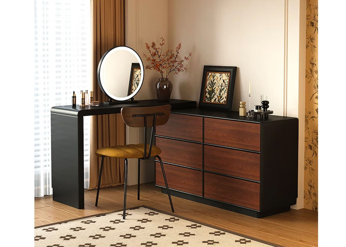 | Model: | 118141802 | Type: | Dressing table | Size: | 1200*400*750+1400*400*700MM | Material: | MDF with black lacquer++MDF with walnut venee | Color: | Black +Walnut | Base/leg Color: | Black +Walnut |