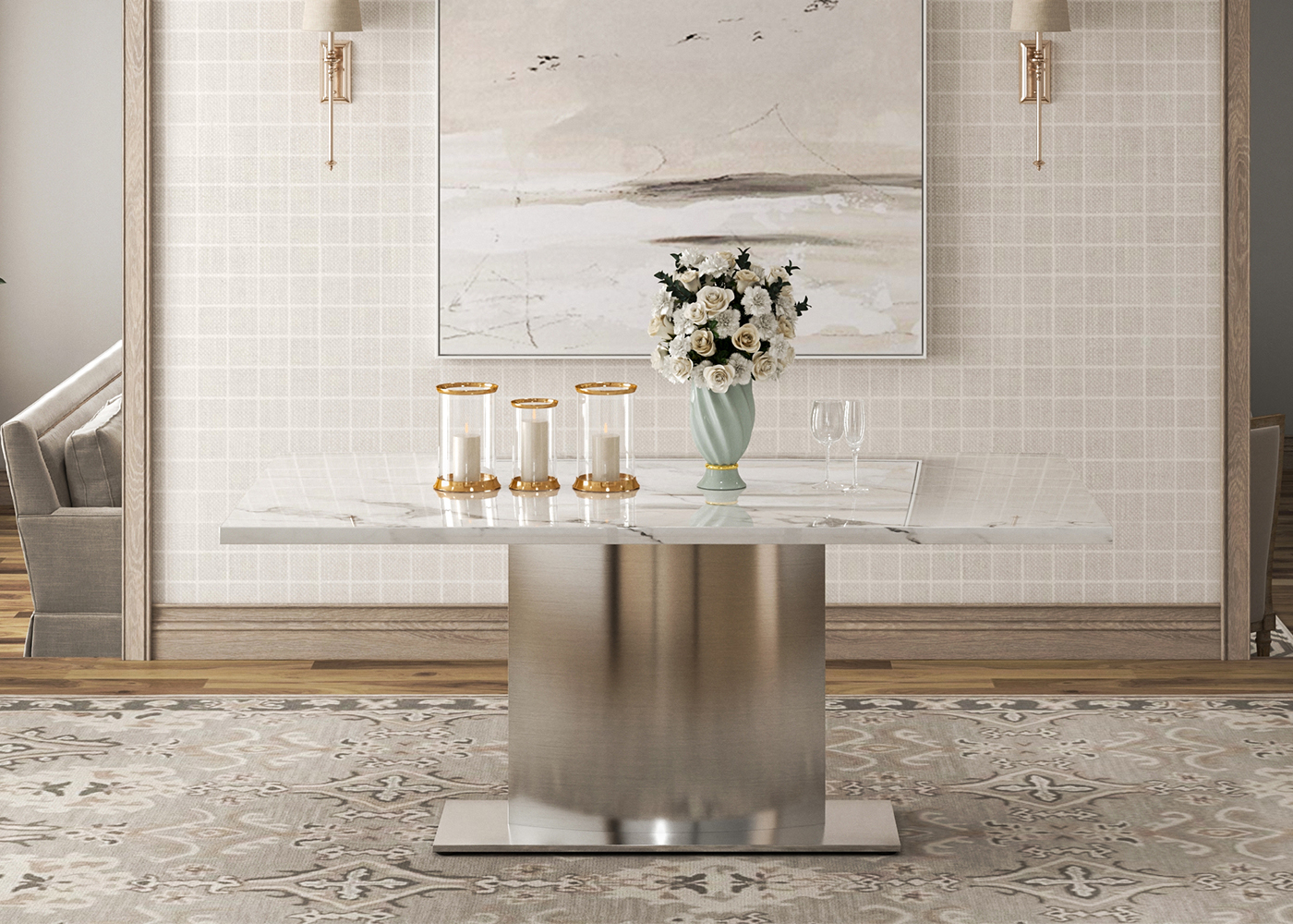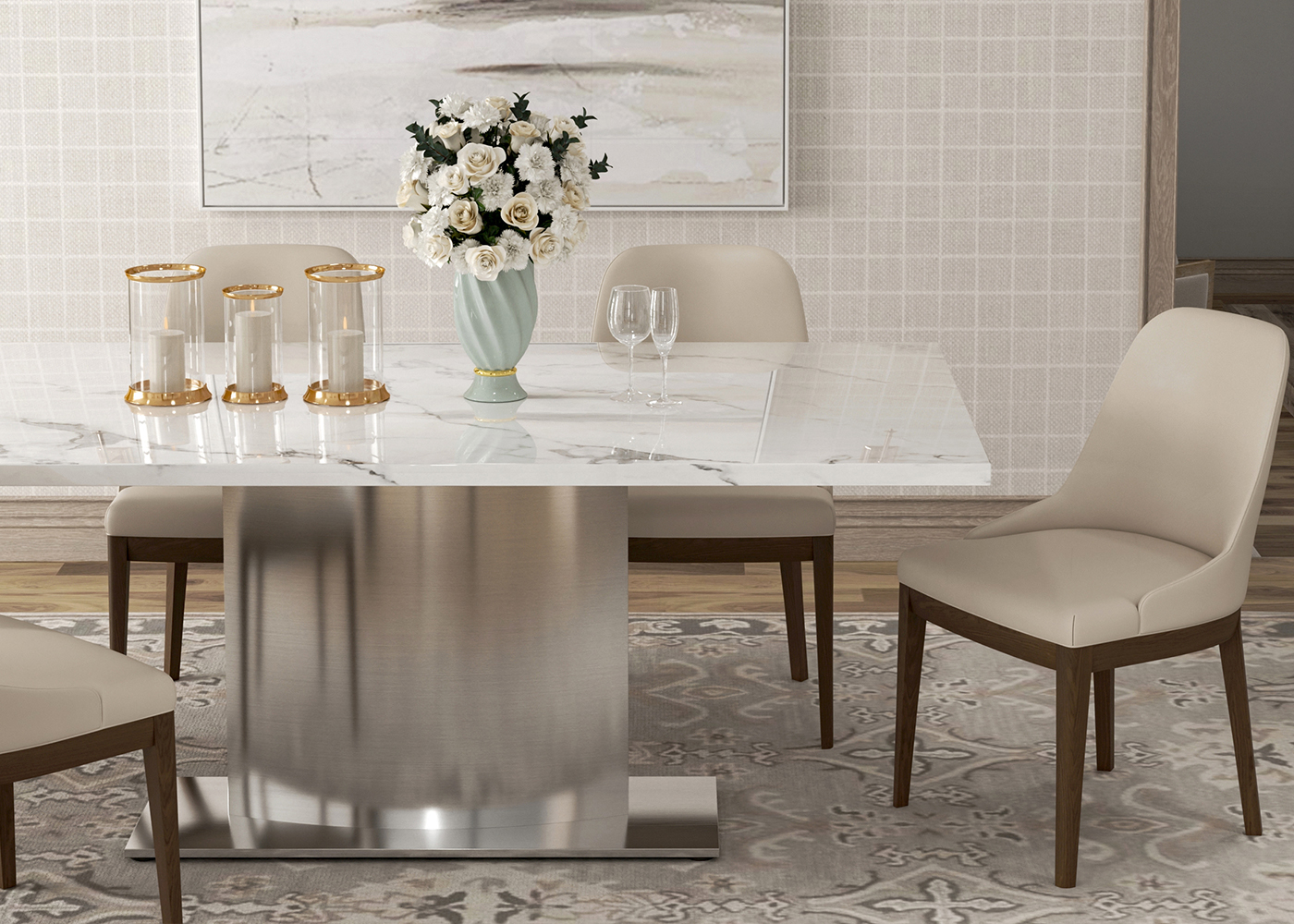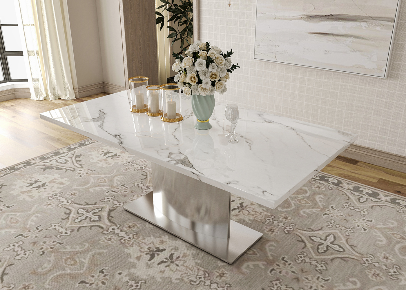 | Model: | 101080602 | Type: | Dining table | Size: | 2000*1070*755MM | Material: | Chinese marble paste marble foil SY757-1+stainless steel brushed | Color: | White | Base/leg Color: | Silver |