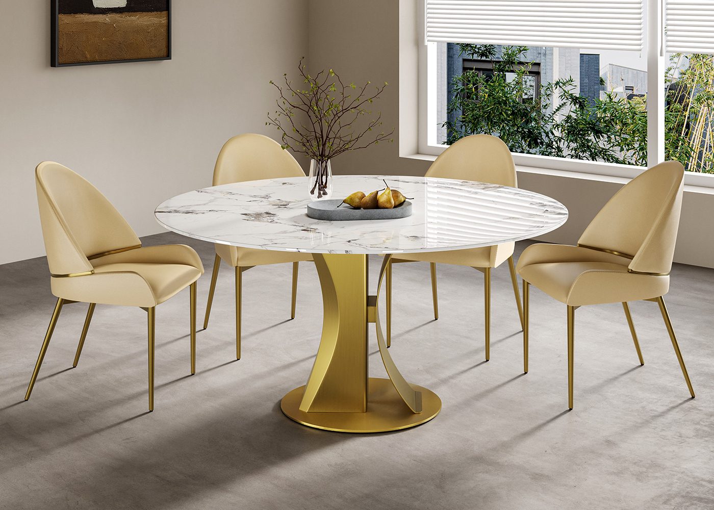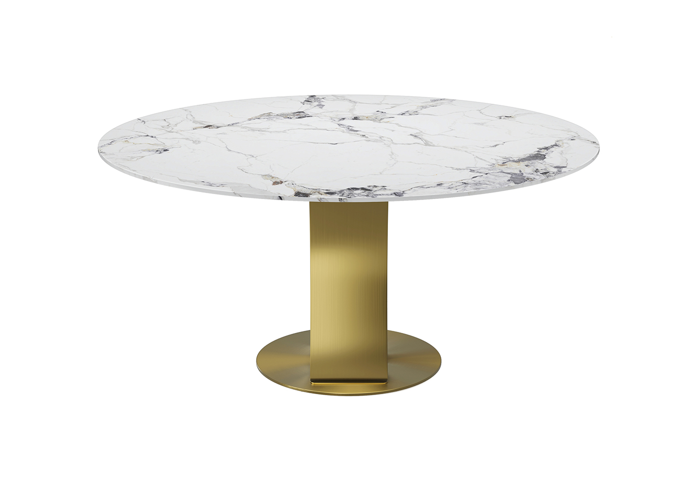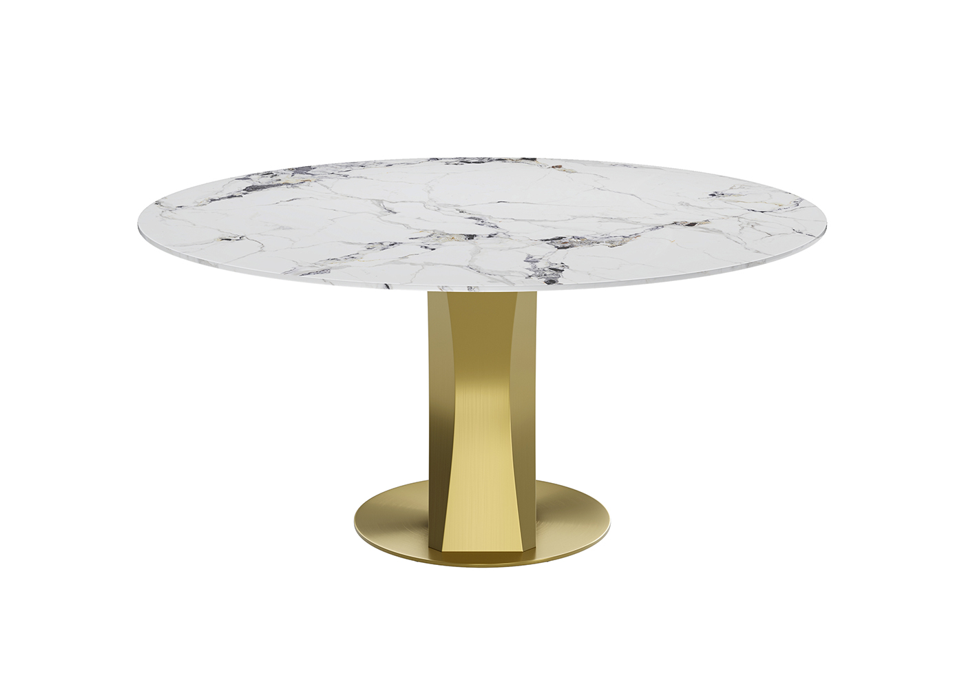 | Model: | 101842903 | Type: | Dining table | Size: | DIA1524*750MM | Material: | sintered stone Baidafeili 16M322 polished+stainless steel brushed plating titanium golden color | Color: | White | Base/leg Color: | Gold+Silver |